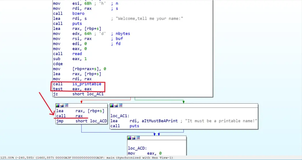 逻辑就是执行is_printable之后,去将eax与自身相与,如果eax的值为1,test执行之后的运算结果为1(标志寄存器的值为0,否则反之)如果标志寄存器的值为1,则jz指令进行跳转,跳转到loc_AC1函数,如果触发了该函数则程序直接结束,并不会触发call rax的指令,如果jz不进行跳转,则执行call rax(执行完lea之后,rax的值存放的就是read函数输入进去的内容,因此我们输入的时候直接布置shellcode即可)。