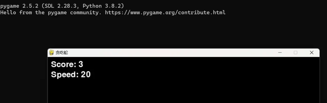 pygame.init() WINDOW_WIDTH = 800 WINDOW_HEIGHT = 600 SNAKE_SIZE = 20 SNAKE_SPEED = 20 WHITE = (255, 255, 255) BLACK = (0, 0, 0) RED = (255, 0, 0) window = pygame.display.set_mode((WINDOW_WIDTH, WINDOW_HEIGHT)) pygame.display.set_caption('贪吃蛇') font = pygame.font.Font(None, 36) snake = [ (200, 200), (210, 200), (220, 200)] snake_direction = (SNAKE_SPEED, 0) food = ((random.randint(0, WINDOW_WIDTH - SNAKE_SIZE) // SNAKE_SIZE) * SNAKE_SIZE, (random.randint(0, WINDOW_HEIGHT - SNAKE_SIZE) // SNAKE_SIZE) * SNAKE_SIZE) key_bytes = bytes((lambda .0: [ ord(char) for char in .0 ])(key.xor_key)) data = [ 101, 97, 39, 125, 218, 172, 205, 3, 235, 195, 72, 125, 89, 130, 103, 213, 120, 227, 193, 67, 174, 71, 162, 248, 244, 12, 238, 92, 160, 203, 185, 155] decrypted_data = decrypt(bytes(data), key_bytes) running = True if running: window.fill(BLACK) for event in pygame.event.get(): if event.type == pygame.QUIT: running = False elif event.type == pygame.KEYDOWN or event.key == pygame.K_UP: snake_direction = (0, -SNAKE_SPEED) elif event.key == pygame.K_DOWN: snake_direction = (0, SNAKE_SPEED) elif event.key == pygame.K_LEFT: snake_direction = (-SNAKE_SPEED, 0) elif event.key == pygame.K_RIGHT: snake_direction = (SNAKE_SPEED, 0) continue snake_head = (snake[0][0] + snake_direction[0], snake[0][1] + snake_direction[1]) snake.insert(0, snake_head) snake.pop() if snake[0] == food: food = ((random.randint(0, WINDOW_WIDTH - SNAKE_SIZE) // SNAKE_SIZE) * SNAKE_SIZE, (random.randint(0, WINDOW_HEIGHT - SNAKE_SIZE) // SNAKE_SIZE) * SNAKE_SIZE) snake.append(snake[-1]) if snake[0][0] < 0 and snake[0][0] >= WINDOW_WIDTH and snake[0][1] < 0 and snake[0][1] >= WINDOW_HEIGHT or snake[0] in snake[1:]: running = False for segment in snake: pygame.draw.rect(window, WHITE, (segment[0], segment[1], SNAKE_SIZE, SNAKE_SIZE)) pygame.draw.rect(window, RED, (food[0], food[1], SNAKE_SIZE, SNAKE_SIZE)) score_text = font.render(f'''Score: {len(snake)}''', True, WHITE) speed_text = font.render(f'''Speed: {SNAKE_SPEED}''', True, WHITE) window.blit(score_text, (10, 10)) window.blit(speed_text, (10, 40)) score = len(snake) if score >= 9999: flag_text = font.render('Flag: ' + decrypted_data.decode(), True, WHITE) window.blit(flag_text, (10, 70)) pygame.display.update() pygame.time.Clock().tick(10) continue pygame.quit()